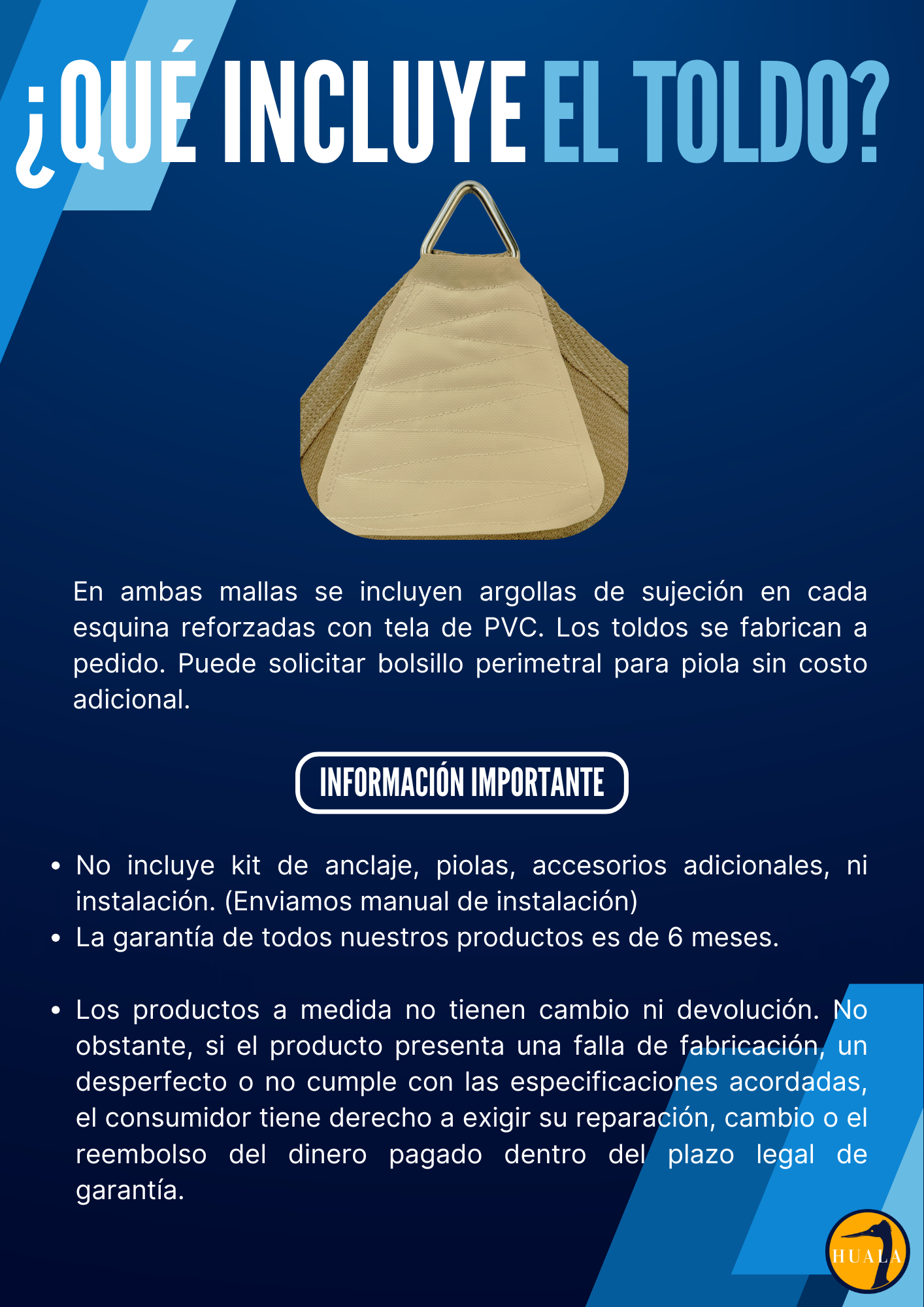Los toldos vela tiene todos sus lados cóncavos, por lo tanto, la medida publicada es de argolla a argolla.